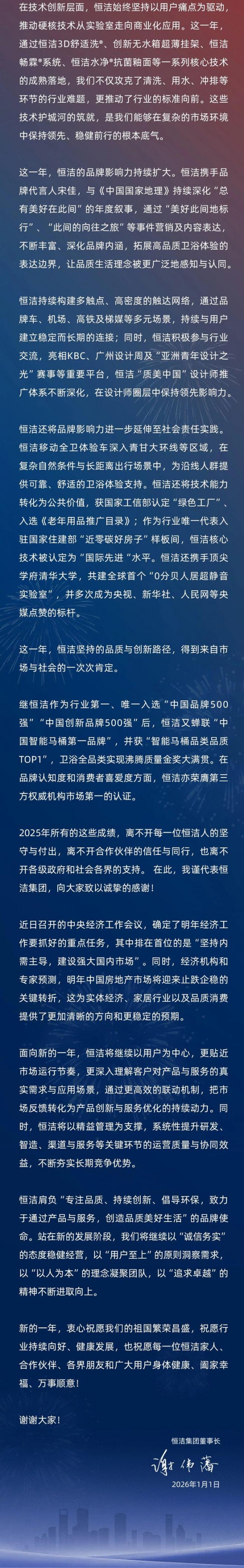 持质而行,进取向新 | 恒洁集团2026年新年贺词