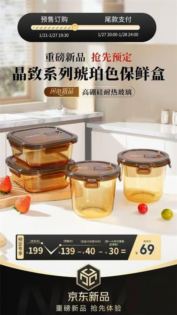 在合作过程中,京东结合最新消费趋势,建议康宁将高辨识度的琥珀色玻璃应用于新品设计。琥珀色不仅提升产品颜值,其材质本身具备耐冷热、防爆、无异味、适用多种厨电等优势,再结合微气孔排压与弧线转角等人性化设计,共同打造出这款集功能与美学于一身的保鲜盒。双方经过多轮对容量、器型、密封工艺等细节打磨,最终以极富竞争力的价格在京东独家首发。该套装日常售价139元,年货节期间首发价直降至99元,限量一万套。超值价格叠加出色性能,使产品一经上线便备受热捧,前15分钟销量即突破3000套,显示出市场对这款高颜值实力派新品的充分肯定。