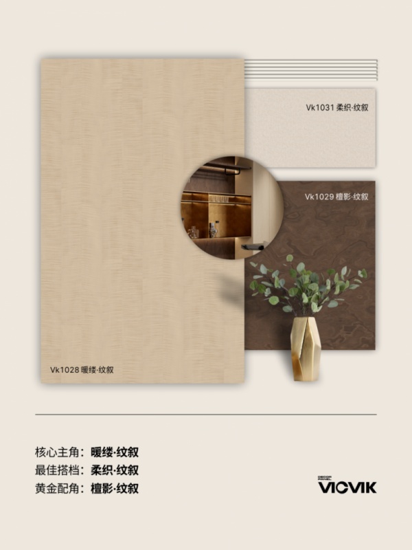 作为家居装修的核心装饰材料,饰面板不仅决定着空间的视觉颜值,更直接影响居住的质感与体验。VICVIK威克深谙静奢风“去过度装饰,重细节质感”的设计精髓,此次推出的系列饰面板以“让材质自己说话”为设计理念,摒弃锐利的线条与夸张的造型,通过软绒般的舒展韵律与自然生动的纹理,打造出内敛而丰盈的静奢气质,让家成为抵御外界喧嚣的温柔堡垒。其中主推的VK1028暖缕·纹叙饰面板,以大地色系为基底,搭配独特的涩触艺术纹理,将自然湖风涟漪的美感凝于材质,完美适配静奢风“松弛显贵”的核心特质,同时兼容原木、轻中式、意式等多种装修风格,成为本次系列的核心主角。