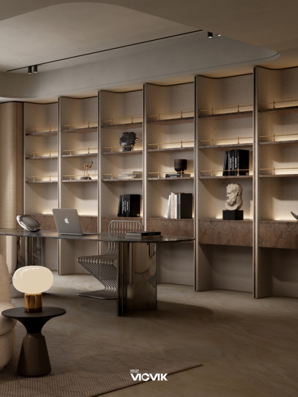 在空间应用上,VICVIK威克美学饰面板实现了不同功能区的自然衔接与美学统一,让静奢质感落地日常。客厅与书房的无界设计中,暖缕·纹叙墙体以温润艺术肌理为基底,如同空间的沉静呼吸自然蔓延;柔织·纹叙饰面板打造的展示柜,以细腻的织物感纹理在灯光下泛起朦胧光晕,与暖缕系列相融相生;弧形家具与浅雅米调书柜的搭配,让线条与肌理碰撞出静谧的阅读角落,墨香与木香在光影中交织,尽显静奢风的精致品味。