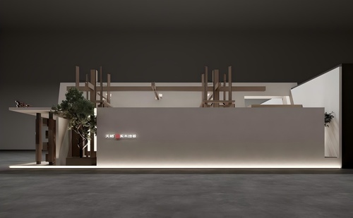 立面设计 通过粗细不一的木质立柱交错拼接,形成多处高耸壮丽的结构装置,犹如飞檐斗拱的意象表达,使整个展馆呈现精巧又壮观的视觉效果。