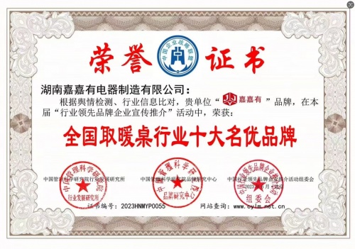 嘉嘉有电器获评“全国取暖桌行业十大名优品牌” 行业标杆建设再获认可