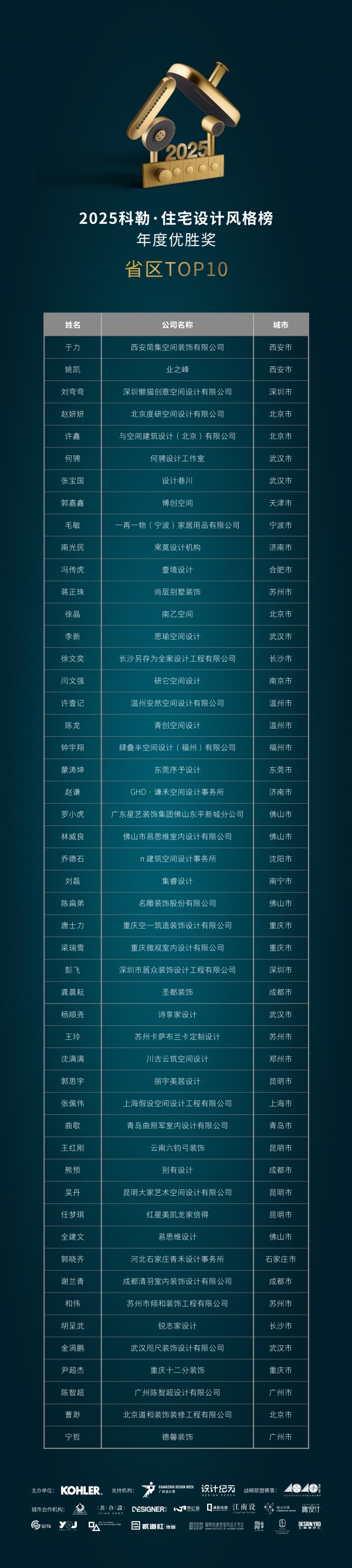 目前,本届大赛设计推荐官已完成线上评审,“2025科勒住宅设计风格榜”作品榜各省区累计评分前10名的优秀作品已出炉。