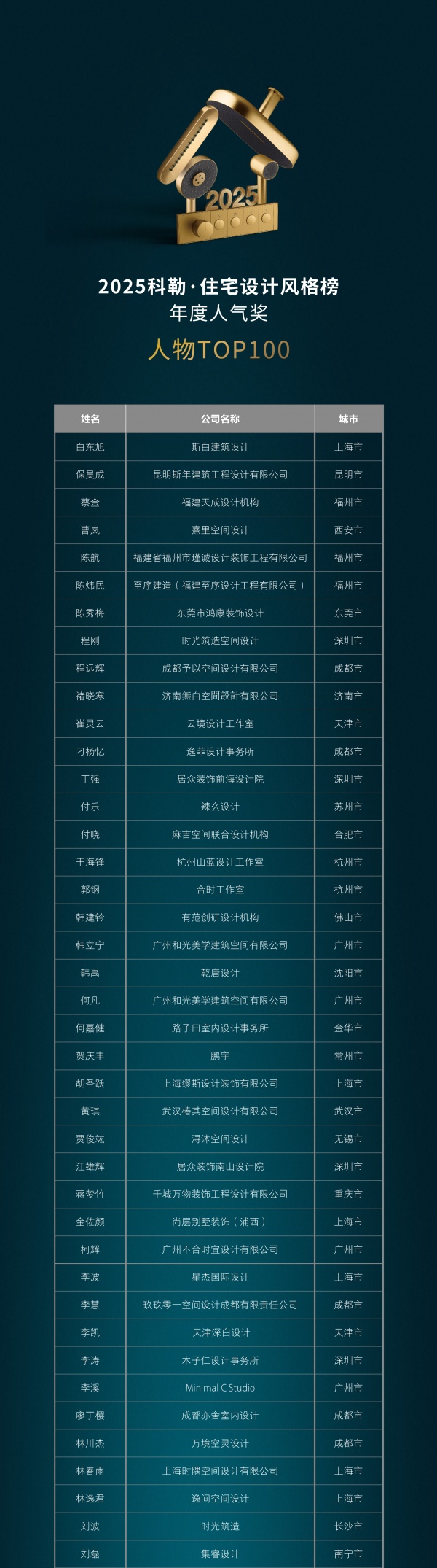 同时,经过组委会及评委团严格评审、综合打分,“2025科勒住宅设计风格榜”人物榜TOP100名单也已出炉。