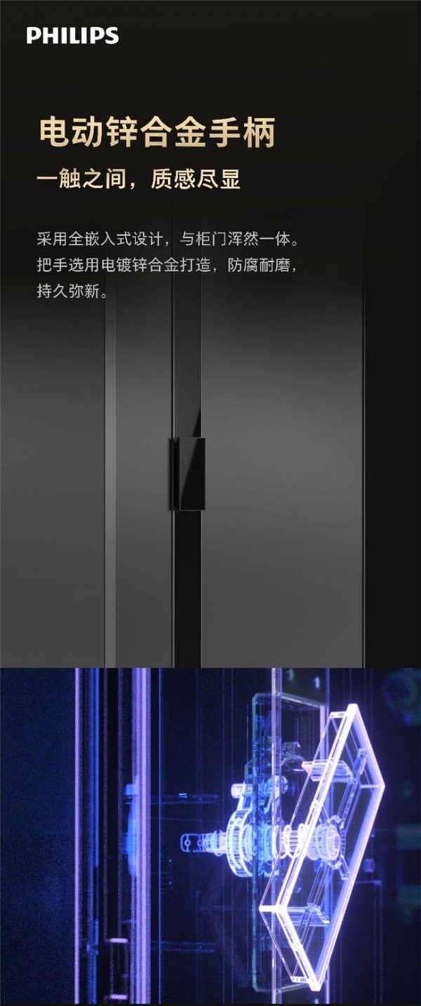 前门板运用先进的VF抗指纹工艺,表面经特殊处理后,能有效抵御指纹、污渍附着,即便经常触摸也能保持光洁如新,无需频繁清洁,既提升了耐用性,又维持了柜体的整洁美观。更具巧思的是电动锌合金手柄设计,采用全嵌入式设计,与柜门浑然一体,不仅操作便捷,更避免了传统外露手柄易被撬动的风险,质感十足的同时兼具防腐耐磨特性,长期使用依旧光亮如新。