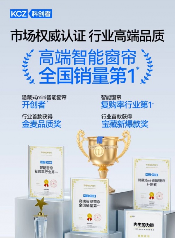 作为高端智能窗帘领域的领军者,科创者(KCZ)实力与口碑双优。市场表现上,它连续10年蝉联天猫、京东、抖音电动窗帘销量TOP1,2025年市占率46%,获沙利文“全球mini智能窗帘销量第一”认证,还是央视“新国货智造”展播品牌,同时拿下“智能窗帘复购率行业第一”“高端智能窗帘全球销量第一”等荣誉,全球销量超5500万台,覆盖57国、服务5000万家庭,2025年618天猫三冠王、京东超级品类日榜首等成绩更印证其电商统治力。