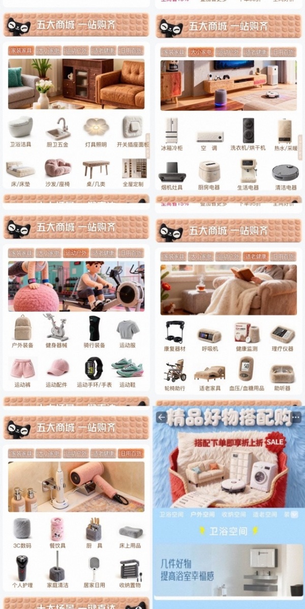 全品类覆盖:平台覆盖家装家具、大小家电、运动户外、适老健康、日用百货五大核心商城。对于装修或焕新用户而言,无需在多个平台、店铺间反复比价切换,反复挑选,极大节约了时间与精力成本。