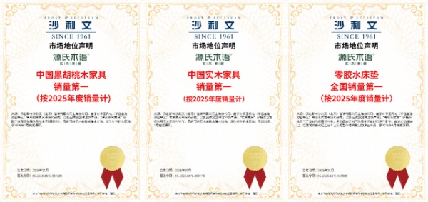 不但如此,全球知名增长咨询机构弗若斯特沙利文(Frost & Sullivan)也向源氏木语颁发三项重磅认证:“中国实木家具销量第一”、“中国黑胡桃木家具销量第一”及“0胶水床垫全国销量第一”。这些基于市场数据的权威背书,进一步夯实了源氏木语在实木赛道的领跑地位,也印证了其在高端材质与健康睡眠领域的深度布局。尤其是黑胡桃木品类的销量领先,凸显了品牌在高端实木市场的强劲竞争力。