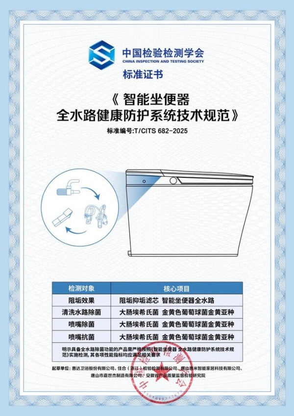 近日,卫浴行业传来好消息!《智能坐便器全水路健康防护系统技术规范》(标准编号:T/CITS 682-2025)(以下简称“全水路健康防护系统”团标)正式通过中国检验检测学会批准发布。这意味着智能卫浴产品在关乎用户健康的核心维度上,首次拥有了统一、可量化且具有高门槛的技术评判规范,标志着中国卫浴行业向“深度健康”发展阶段迈出了关键一步。