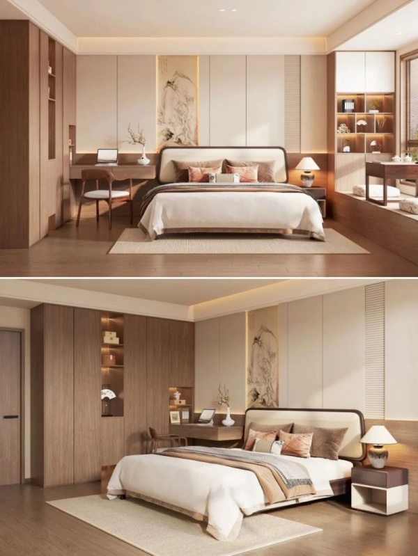 拼色床头背景墙内嵌山水画,宋式意蕴悄然流露,营造清雅宁静的氛围。衣柜与书桌一体化设计,实用性强;飘窗改造为卡座茶台,定制储物柜,既能窝着晒太阳、品清茶,又能满足收纳需求。