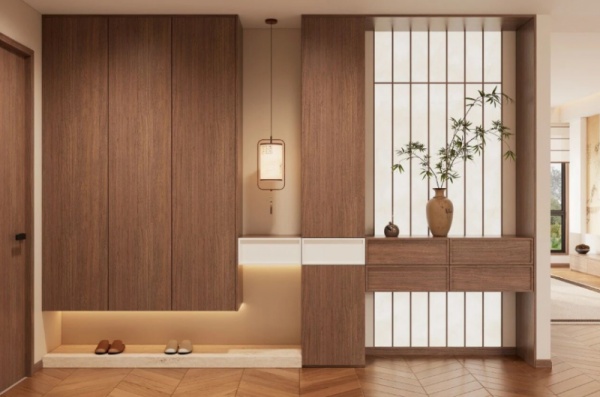悬浮定制鞋柜提供充足收纳空间,地台设计方便收纳常穿鞋物,日常清洁也更轻松。入户处的栅格屏风灵动透光,中式长吊灯增添空间韵律感,将宋式美学中“移步换景”的巧思,悄悄藏进归家的第一眼。