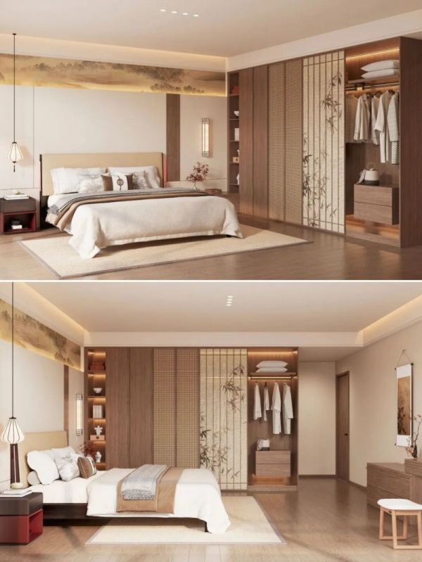 衣柜采用掩门、藤编门与栅格门的组合设计,竹影婆娑的意象如宋画竹石图般诗意盎然。衣柜与床头柜一体化设计,延续整体气韵,挂衣区、抽屉、开放格一目了然,让衣物拿取井然有序。