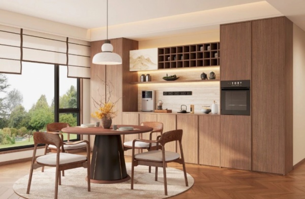 一体化定制餐边柜将实用与美学融于一体。木纹细腻雅致,骨骼线设计更添立体感。上层开放式酒格可收纳茶杯与清酒,中间台面充当吧台,沏茶冲咖皆从容,让日常的每一餐都带着宋人的闲适。