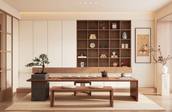 内嵌整墙茶柜,错落有致的开放格藏露有序,既有装饰之美,又能收纳茶具茶罐。案头摆上迎客松盆景,搭配古意长茶桌,泡上一盏清茶,悠然又闲适,让人暂别喧嚣,回归内心。