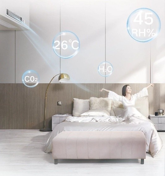 理想的睡眠环境需要兼顾多重需求,仅靠单一功能优化往往难以实现,更需要通过系统协同综合解决。大金系统化空气解决方案,可一站式打造舒适、健康且安静的睡眠环境。中央空调依托魔力热回收三管技术,实现温湿度独立调节,除湿不降温,整夜体感温润舒适;搭配 3D 气流技术均匀打散气流,营造柔和自然风,减少直吹不适感。新风系统持续引入并多重过滤3室外新鲜空气,在密闭环境下也有能降低二氧化碳浓度,维持空气洁净清新,为安心睡眠营造健康的呼吸条件。同时搭载降噪设计,空调运转音最低仅17dB(A)4,营造静谧安稳的睡眠氛围。