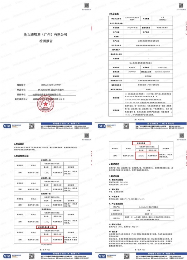 Dr.Schiller 5S闪释小白片实测:根据Standard Testing Group Co., Ltd.出具的人体功效实测报告(报告编号:STDGZ-H240426002N),使用者每日早晚各服用1片,坚持仅7天后,脸颊部位的黑色素含量显著降低了5.54%,肌肤光泽度更是大幅提升了37.96%。
