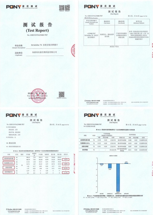 Dr.Schiller 7S闪释小白片实测:根据Pony Testing International Group出具的人体功效实测报告(报告编号:No.GSECGV9A2508817R7),在同样的使用方式与周期下,7天内受试者黑色素减少4.87%,色斑面积缩小3.89%。