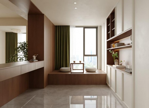 休闲区作为入户后的过渡空间,也是日常放松的多功能角落,以“窗边松弛感小筑”为主题,打造一处可坐、可茶、可观景的治愈区域。整体以胡桃木的温润棕调为主,搭配奶油白柜体与橄榄绿窗帘,借由低饱和配色营造宁静、柔和的空间氛围。浅灰亮面瓷砖的冷调反光,则巧妙中和了木质的暖感,让整体空间更显清爽与透气。
