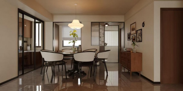 餐厅作为家人日常用餐与互动交流的核心区域,以“复古烟火气餐厨联动区”为主题,呈现出温暖而富有生活气息的空间表情。墙面采用暖米色乳胶漆,搭配胡桃木餐边柜与深色地面砖,通过深浅对比强化空间层次;黑色玻璃框移门与长虹玻璃隔断在划分餐厨功能的同时,保留了视觉上的通透感,并为空间注入精致复古的气质。