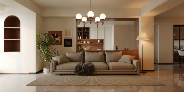 客厅作为家庭的核心社交场景,以“中古风松弛感核心社交区”为主题,在复古与松弛之间取得平衡,满足会客、休闲与审美表达等多重需求。墙面以暖米色乳胶漆打底,搭配胡桃木半墙隔断与奶咖色布艺沙发,形成柔和而富有层次的色彩关系。地面通铺浅米色瓷砖,并辅以编织地毯,不仅提升了空间明亮度,也为空间增添温暖而舒适的脚感。