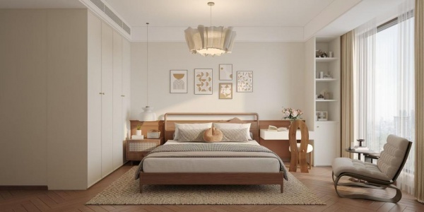 主卧以“中古风治愈休憩空间”为主题,强调以睡眠为核心的复合型休憩体验,打造集睡眠、梳妆与阅读于一体的私享秘境。整体采用奶油白与胡桃木的经典配色,搭配浅棕色人字拼木地板,让空间呈现出温暖柔和的基调。浅米色乳胶漆墙面作为背景,与原木家具及暖调软装层层叠加,进一步强化空间的温柔与安定感。