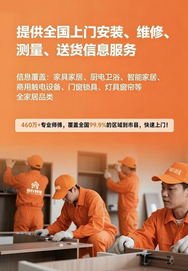 奇兵到家用460万+师傅和99.9%的覆盖率证明:服务的边界,就是市场的边界。找师傅找工人,就用奇兵到家,以更广的覆盖、更高的效率、更优的品质,助力家居商家打通“最后一公里”,让每一次交付都成为品牌价值的延伸。