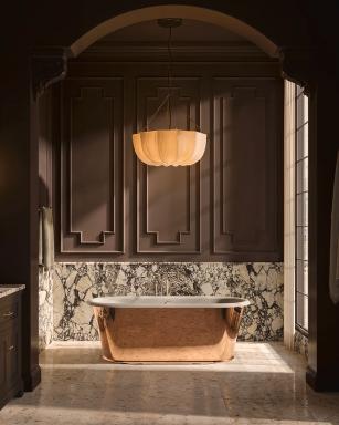 The Flamingo Estate Bathhouse by Kohler将沐浴体验升华为一场身心修复之旅,打造兼具仪式感与休憩属性的私享空间。于此,身体得以舒缓放松,内心重归宁静平和,人们对光影、水流与材质的细腻感知亦被重新唤醒。空间中央陈列着科勒全新 Reverie 独立式铸铁浴缸,其纯铜裙边历经精细打磨与匠心抛光,将经典铸铁基底与铜质金属质感精妙相融。品牌以传统手工成型、焊接及表面处理工艺,在经典材质之上注入当代艺术表达,成就兼具质感与美学的卫浴臻品。浴缸温润光泽的表面,将透过大幅彩绘玻璃窗倾泻而入的日光悉数捕捉,成为整个空间的视觉焦点;200 支 Flamingo Estate 蜡烛错落点缀于浴室墙面,光影交织间,更添静谧雅致的氛围,营造出兼具冥想感与仪式感的沐浴意境。
