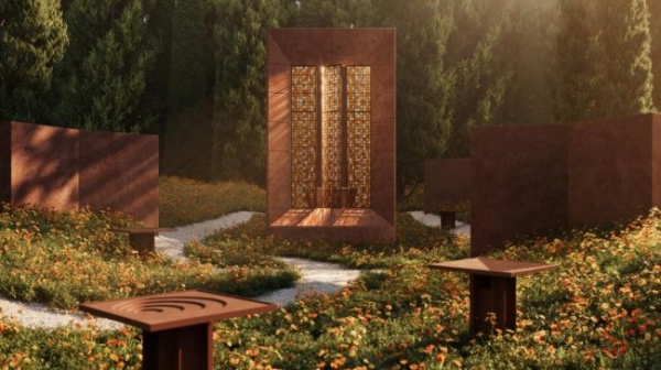 该装置以一座粗犷主义风格的浴疗空间为核心建筑,其设计灵感源自Flamingo Estate坐落在加利福尼亚山丘中的标志性浴疗空间,并全新演绎了科勒经典独立铸铁浴缸——搭配纯铜裙边,呈现层次丰富的铜色质感,彰显臻品工艺与不凡格调。整座装置静谧而富有象征意义,从风化金属与自然原生材质中萃取色彩与肌理质感,仿若从场地中自然生长而成,生动诠释了人与自然共生的设计哲学。