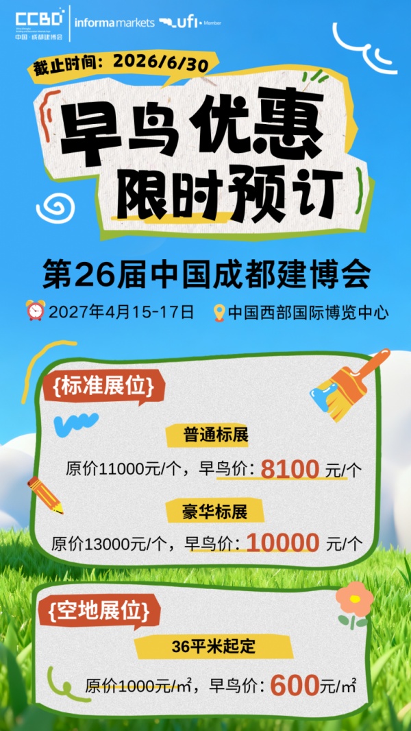 2027年4月15-17日,第二十六届中国(成都)建筑及装饰材料博览会,将继续落地中国西部国际博览城,全方位迭代升级,重塑西南行业展会标杆。